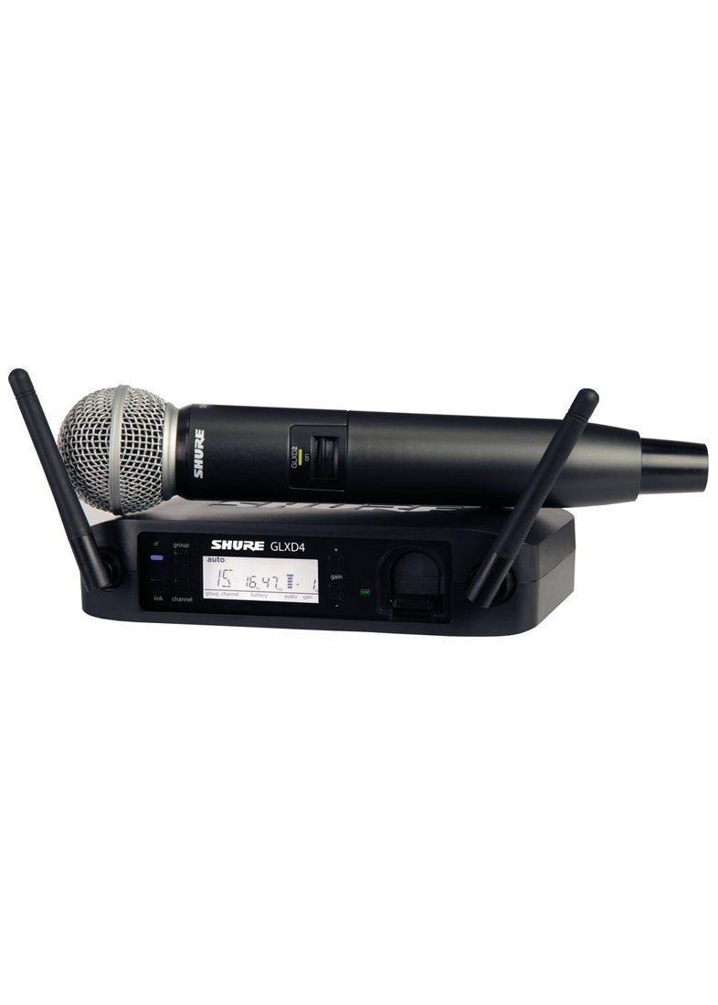 O Shure GLXD24/SM58 – Sistema Sem Fio de Mão inclui um receptor sem fio GLXD4; e um transmissor de mão GLXD2 com um microfone SM58. O sistema opera na banda ISM de 2.4GHz na banda de frequência Z2, entre 2400 e 2483.5MHz.
