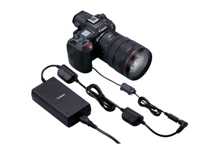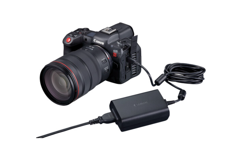 Para obter a funcionalidade completa da lente eletrônica com todas as resoluções e taxas de quadros do Cinema RAW Light, você pode usar o adaptador de alimentação CA-946 com o novo acoplador DC DR-E6C para fontes de alimentação de bateria D-Tap profissional ou principal, ou você pode usar um banco de potência, como o Anker PowerCode 26800mAh PD ou omnicharge Omni Mobile 25600mAh.