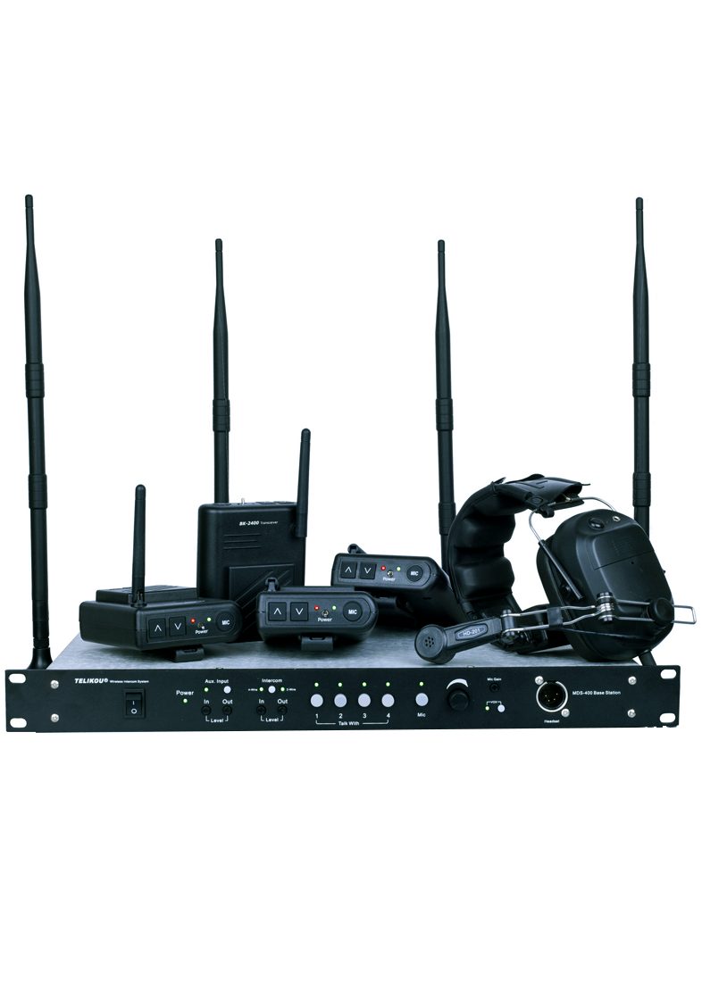 A estação TELIKOU MDS-400 intercom wireless 4 canais adota a principal frequência de 2,4 GHz. É transmissor e recpetor de áudio bidirecional completo.O Telikou MDS-400 é adequado para a comunicação, fora de difusão van, show, e em outros lugares onde é necessária a comunicação sem fio. Cada Telikou MDS-400 pode trabalhar com quatro BK-2400 comunicadores sem fio juntos.