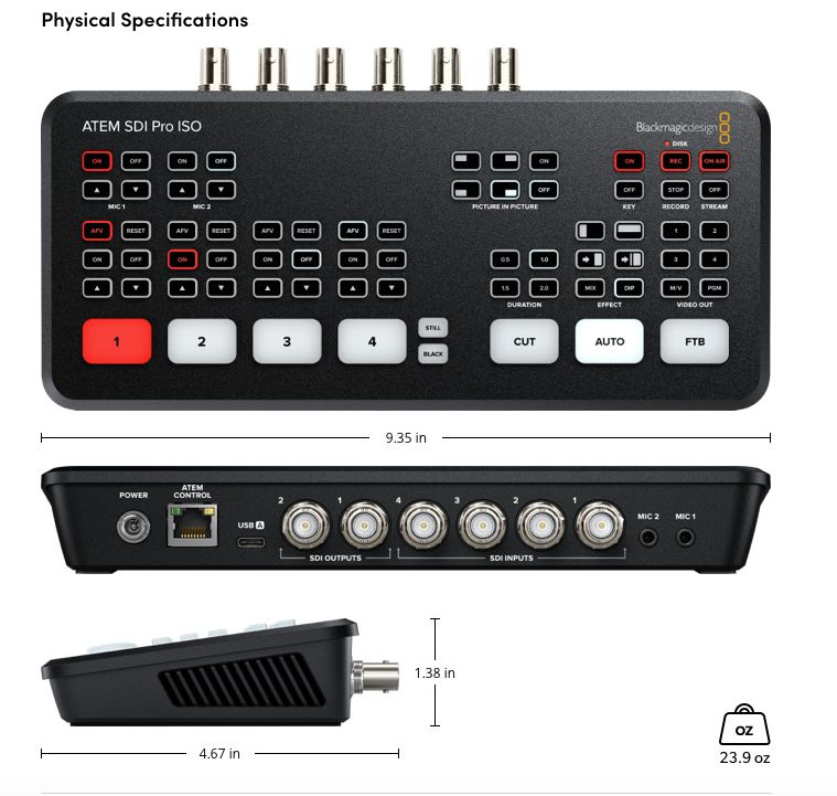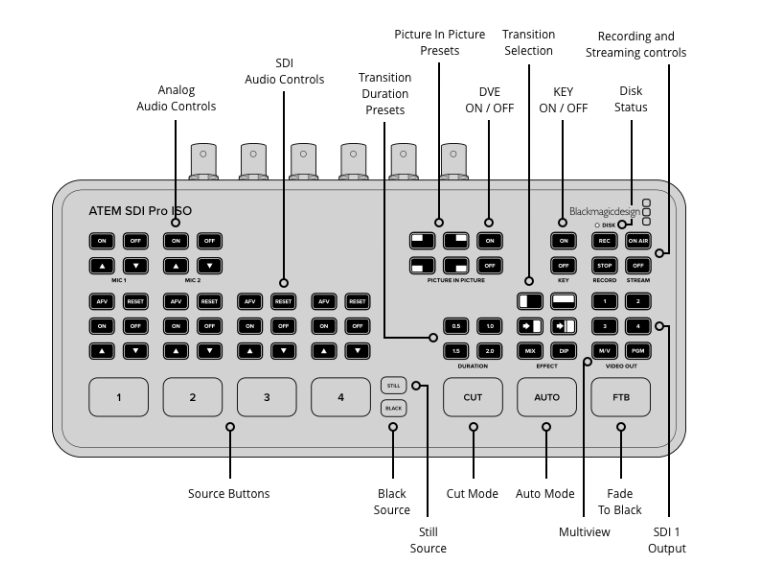 Includes ATEM Software Control Panel. Also compatible with ATEM 1 M/E Advanced Panel, ATEM 2 M/E Advanced Panel and ATEM 4 M/E Advanced Panel. ATEM SDI Pro ISO can be configured using Blackmagic Videohub Hardware Panel Setup utility to route sources to destinations using Videohub Smart Control Pro and Videohub Master Control Pro. Control Panel Included