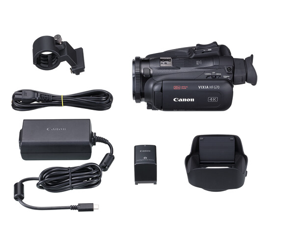 Também está incluído um adaptador CA com um cabo adaptador, uma bateria BP-820, uma tampa de lente e um pára-sol com barreira de lente.